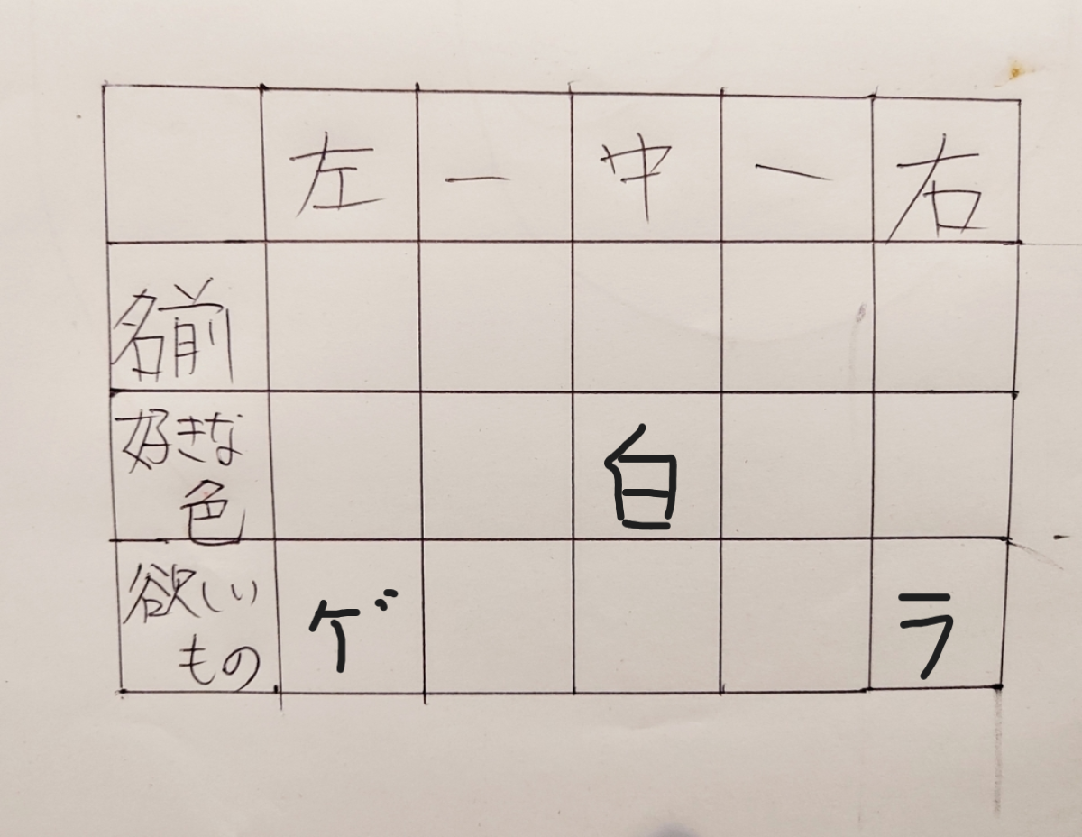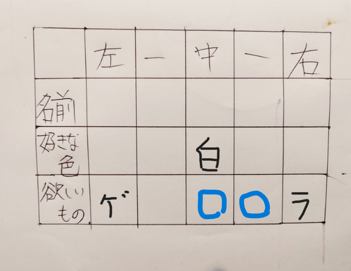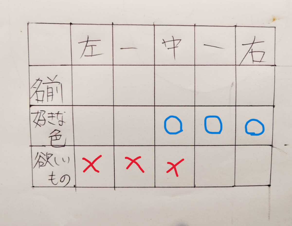 しかし「②ゲームが欲しい人は白がすきな人の2つ左」から、白が好きな人は下の表の青〇のどこかだとわかります。